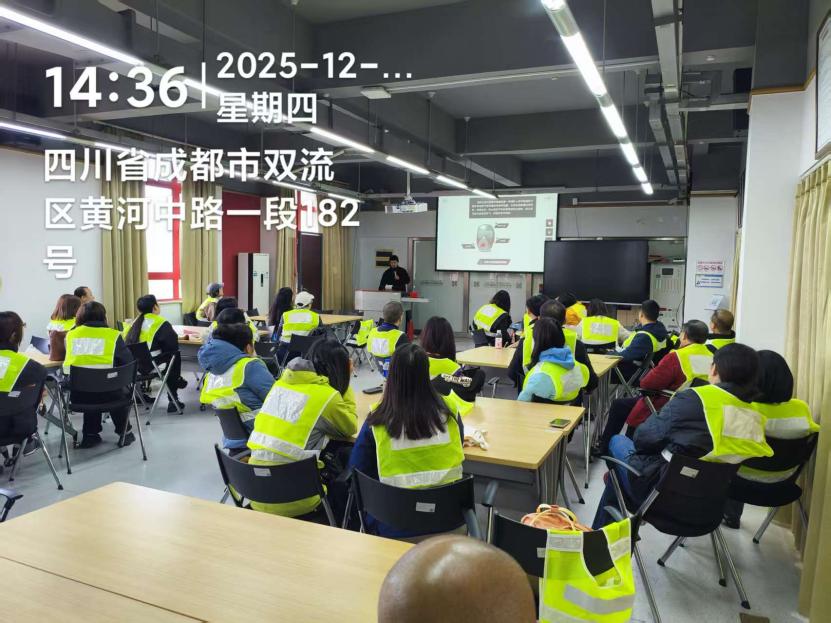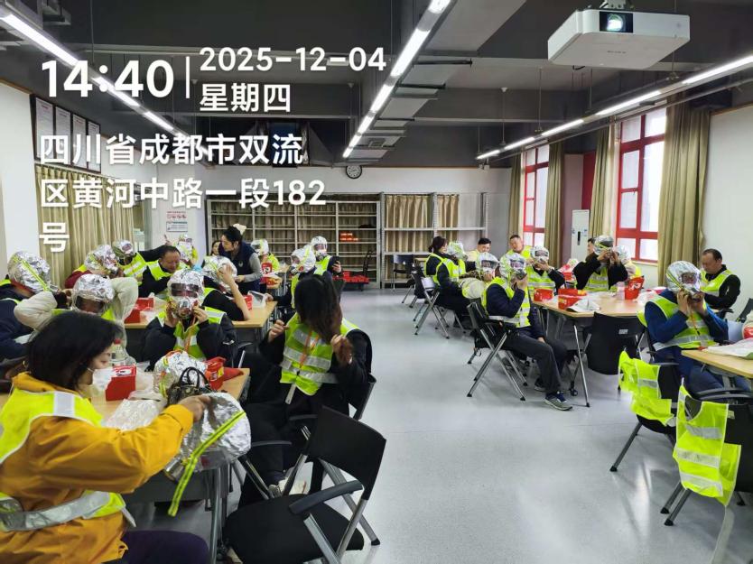 2025年12月4日下午15:00,演练在四川大学江安校区灾后学院进行,演练现场还设置了消防安全知识展示区,通过图文展板、实物演示等方式,向大家普及灭火器的使用方法、消防防毒面具佩戴、常见火灾隐患排查等知识。